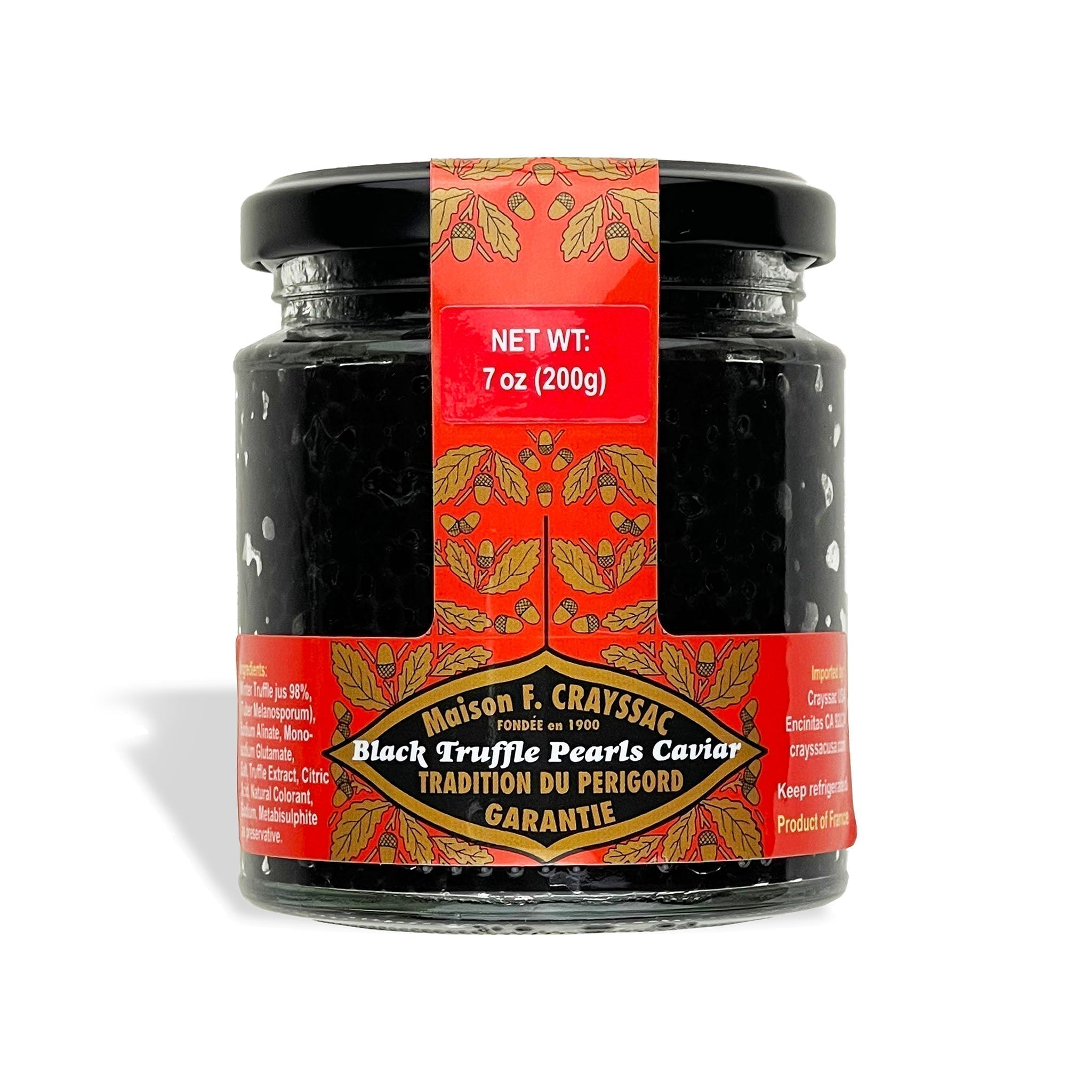 Maison Crayssac's Black Truffle Pearl Caviar is made with Black Winter Truffle juice that's been transformed into pearls using spherification. From there, squid ink is used to enhance the natural coloration of the Truffle. Black Truffle Pearl Caviar does not contain any animal products, other than squid ink. It can be used as a garnishing for fish, vegetables, or meats. You can also put it in a glass of champagne as a flavorful garnishing.Â