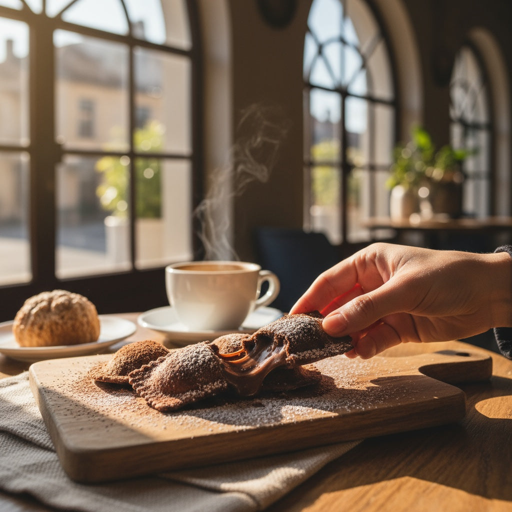 Mind-blowing chocolate ravioli that'll make you say 'wow!' We've taken Italian pasta-making tradition and turned it into something totally unexpected - dessert! Each chocolate pasta pocket is filled with nostalgic flavors you love, creating a unique treat that's perfect for sharing (or not - we won't judge