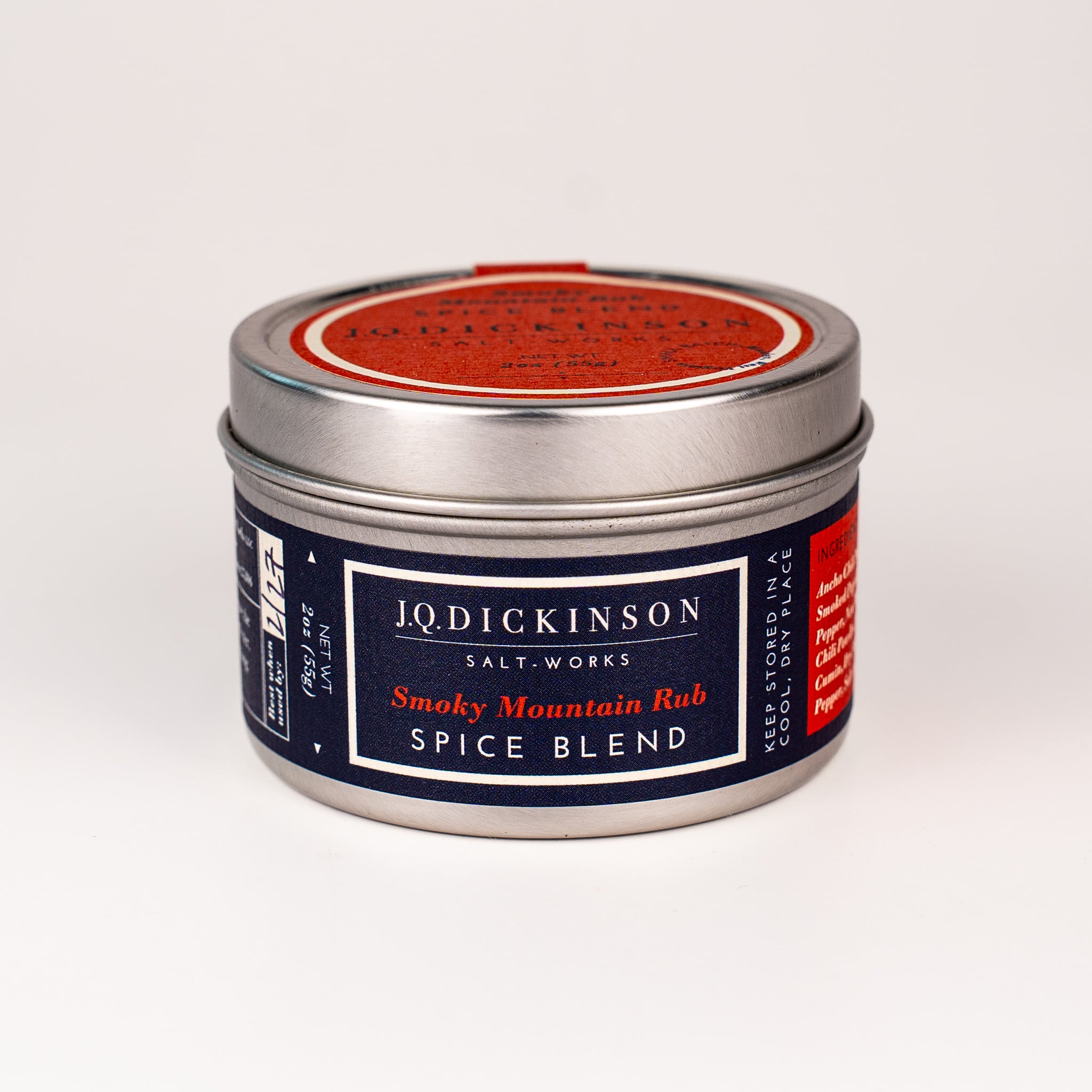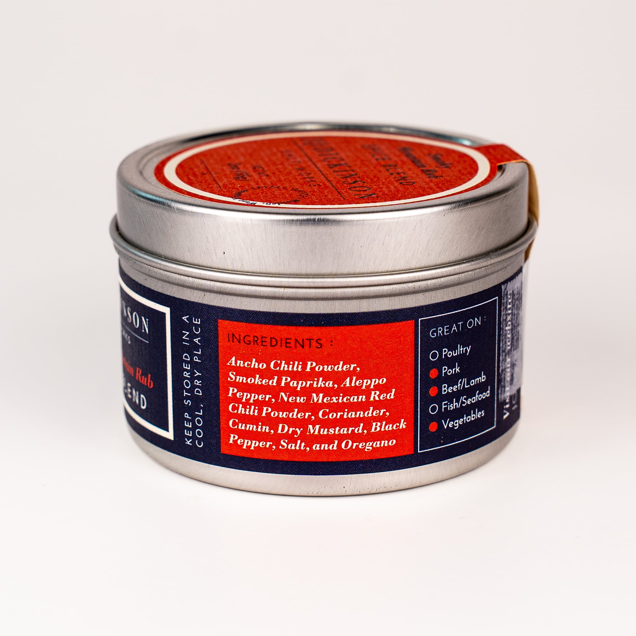 Smoky Mountain Rub: Ancho Chili Powder, Smoked Paprika, Aleppo Pepper, New Mexican Red Chili Powder, Coriander, Cumin, Dry Mustard, Black Pepper, Salt, and Oregano